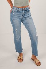 Say hello to your new denim go-to: the Aria Light Wash High-Rise Distressed Stretch Straight Jeans! These effortlessly cool jeans feature a flattering high-rise fit and a laid-back straight leg silhouette that hits right at the ankle for that perfectly cropped look. The light wash adds a vintage vibe, while distressed details throughout give them just the right amount of edge. Whether you’re dressing them up with heels and a blouse or keeping it casual with sneakers and a tee, these jeans will be your wardrobe MVP all season long! Stretchy Light Wash Denim Fabrication High-Rise Distressed Button + Hidden Zipper Fly Closure Classic 5-Pocket Cut Belt Loops Straight Leg Fit Frayed Hems 93% Cotton, 5% Polyester, 2% Spandex Machine Wash Cold Inside Out, Tumble Dry Low Model is 5’4″ and wearing a Size 24.Garment Measurements in Inches:24 | Waist 24” | Hips 31” | Length 37” | Inseam 26.5″25 | Waist 25” | Hips 32” | Length 37” | Inseam 26.5”26 | Waist 26” | Hips 33” | Length 37.5” | Inseam 27”27 | Waist 27” | Hips 34” | Length 37.5” | Inseam 27”28 | Waist 28” | Hips 35” | Length 37.5” | Inseam 27”29 | Waist 29” | Hips 36” | Length 38” | Inseam 27”30 | Waist 30” | Hips 37” | Length 38” | Inseam 27″31 | Waist 31” | Hips 38” | Length 38.5” | Inseam 27.5″32 | Waist 32” | Hips 40” | Length 38.5” | Inseam 27.5″
